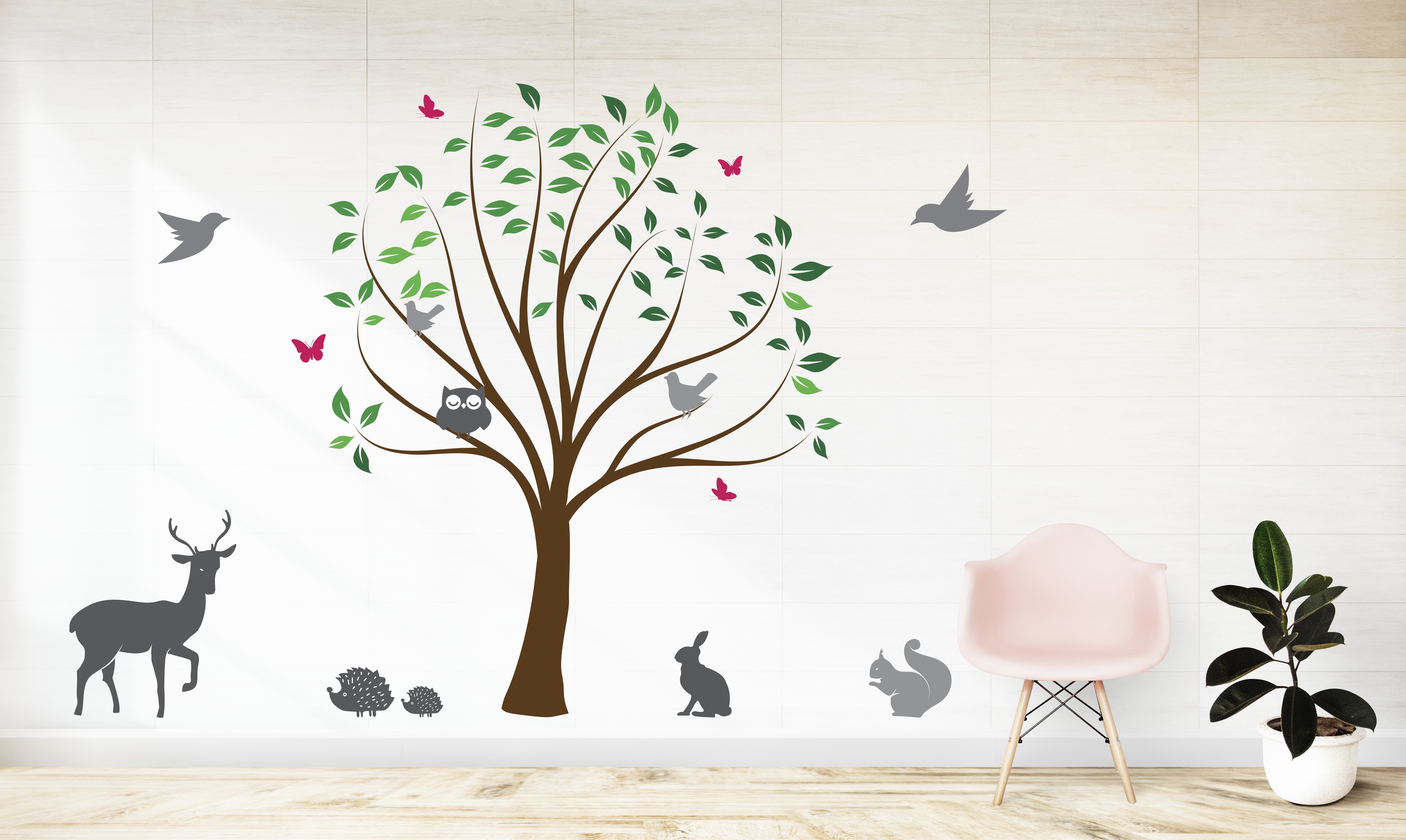 The kit includes animals and a tree. The graphics can be applied on the wall as you like.