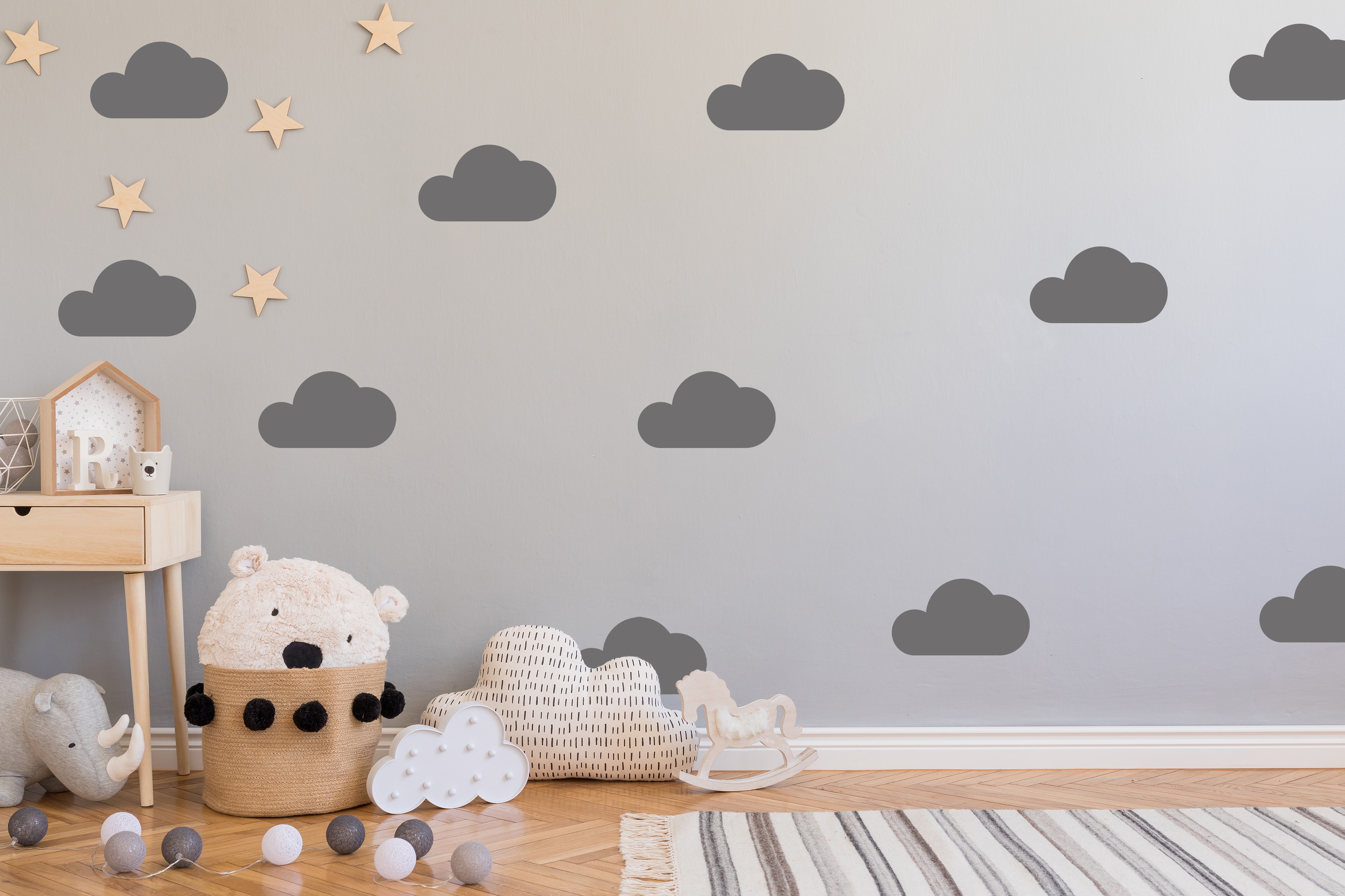 Sticker contains a variety of cloud sizes that can be installed as desired (approximately 60 pieces). The stickers are glued to 1x1 meter sheet.